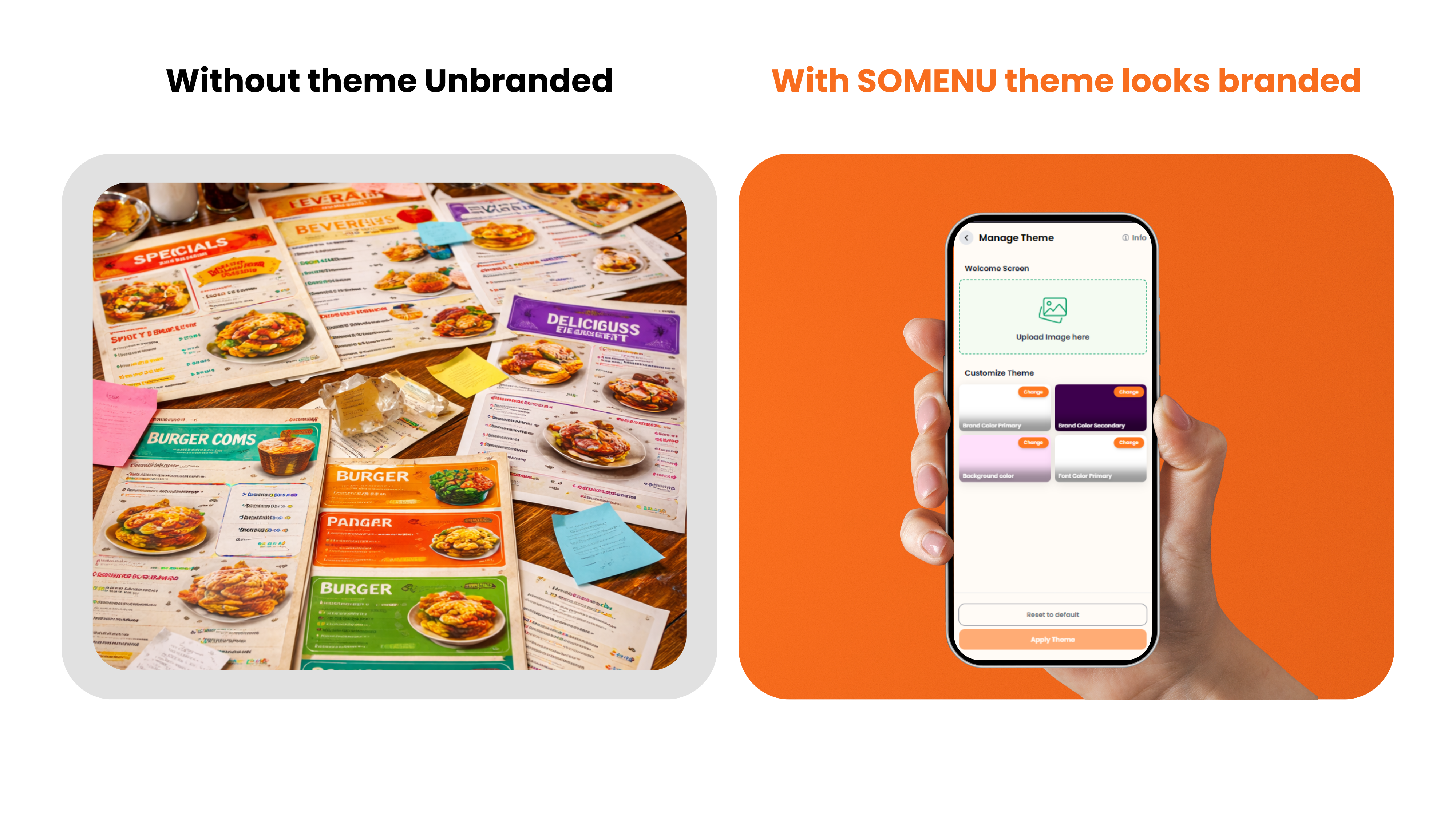 Create a menu that truly matches your brand. With SOMENU’s Theme Management, you can easily customize text colors, card and background colors, and more no design skills required.